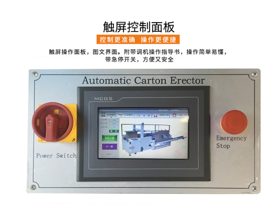 自動開箱機是將疊成紙板的箱板自動打開,箱子底部按照一定程序折合,并用膠帶密封后輸送給裝箱機的設備。自動開箱機采用P.L.C + 觸摸顯示屏控制,設有缺料提前報警,無料自動停機的安全裝置,大大方便操作,減少生產人員和勞動強度。可配合熱熔機封箱。此款自動開箱機是較常用的標準機型,開箱能力是12箱/分鐘。